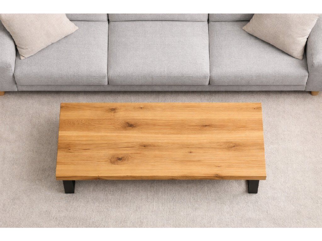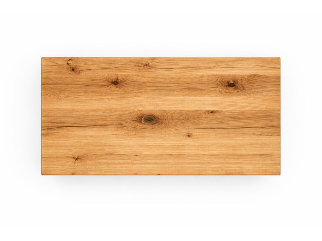 Deska má být z masivního dubu, s klidnou a dobře čitelnou kresbou dřeva. Rovná hrana dodává stolku čistý a vyvážený vzhled, díky kterému působí elegantněji a technicky čistěji než rustikální varianta. Celkové provedení má odpovídat stylu drevaq: poctivé řemeslo, kvalitní opracování, matný až jemně saténový povrch a přirozený charakter materiálu.