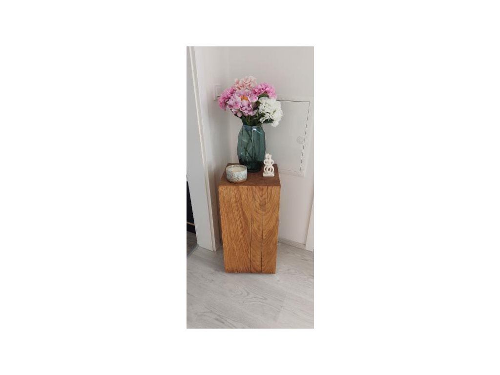 Masivní hranatý špalek z českého dubového dřeva o výšce cca 45 cm a rozměru přibližně 35×35 cm, ručně opracovaný s důrazem na přirozenou kresbu a čistý vzhled. Nadčasový interiérový doplněk s poctivým řemeslným charakterem.