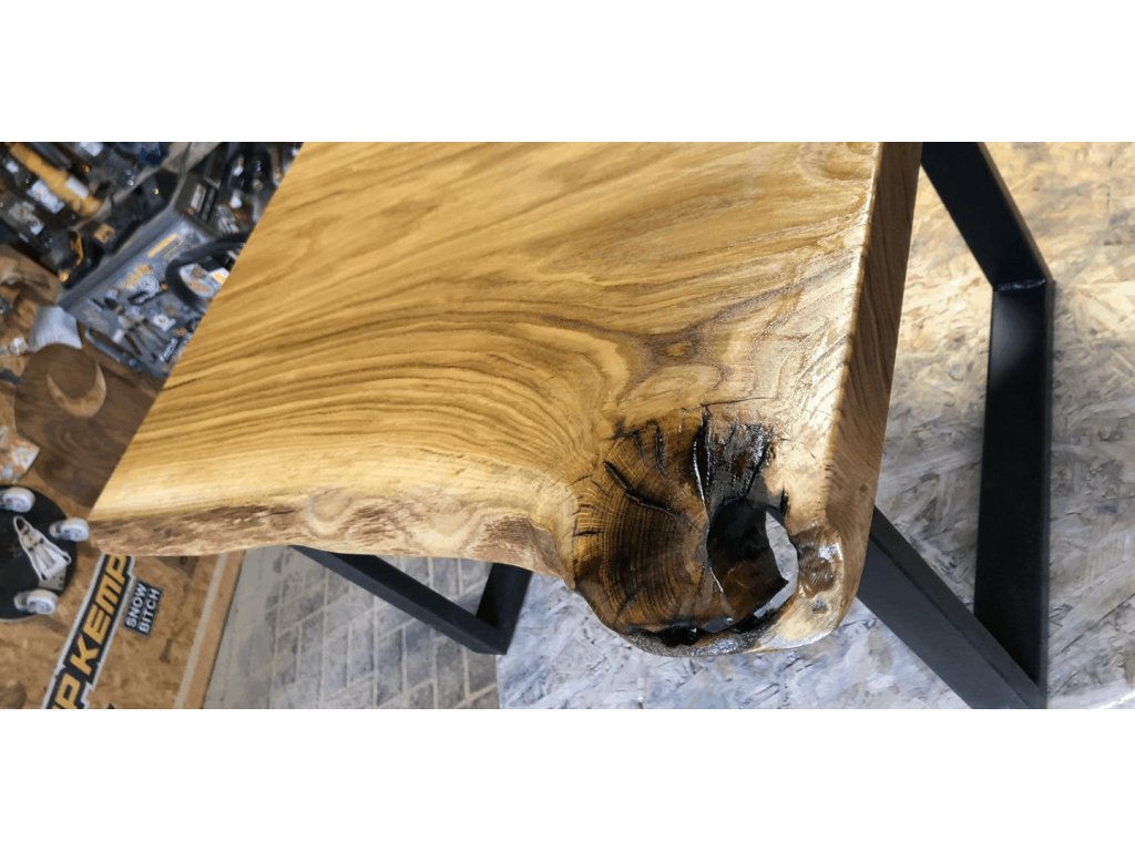 Povrch je ručně broušený a ošetřený přírodními oleji a vosky, které zvýrazňují kresbu dřeva a chrání ho před poškozením. Deska je usazená do ocelové konstrukce, která kontrastuje s divokou přírodností materiálu a dává stolku moderní, elegantní tvar.