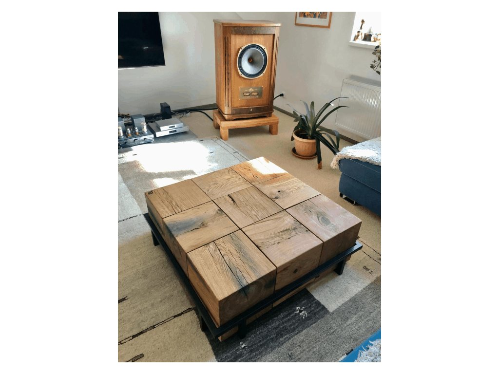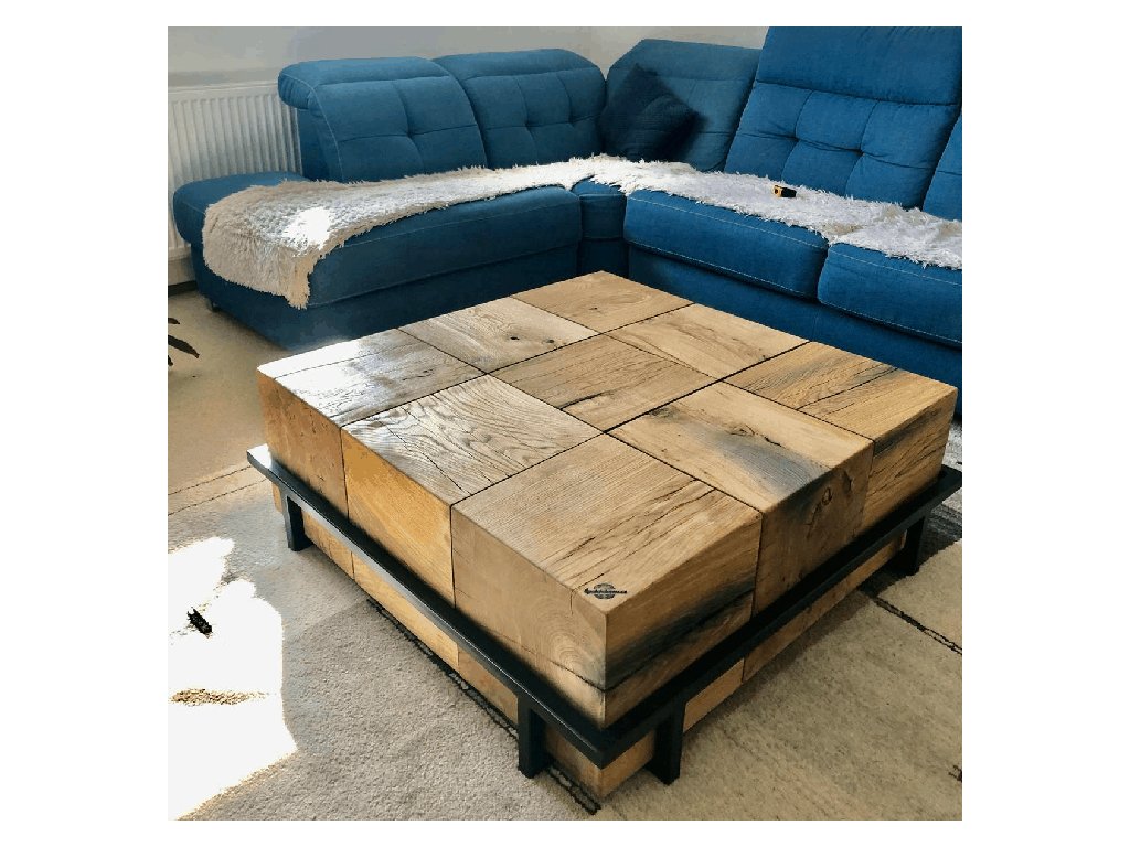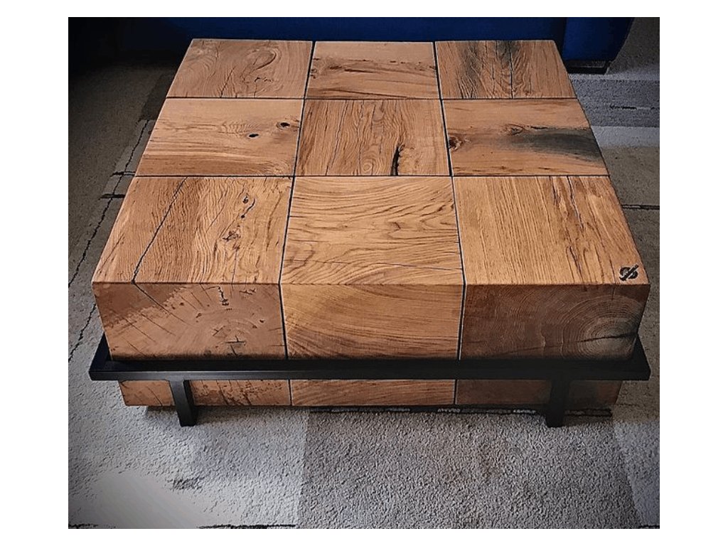 Designový konferenční stolek z masivního dubu zasazený do černé ocelové konstrukce. Devět ručně opracovaných dřevěných bloků tvoří kompaktní celek, který spojuje přírodní sílu dřeva s moderní přesností kovu.