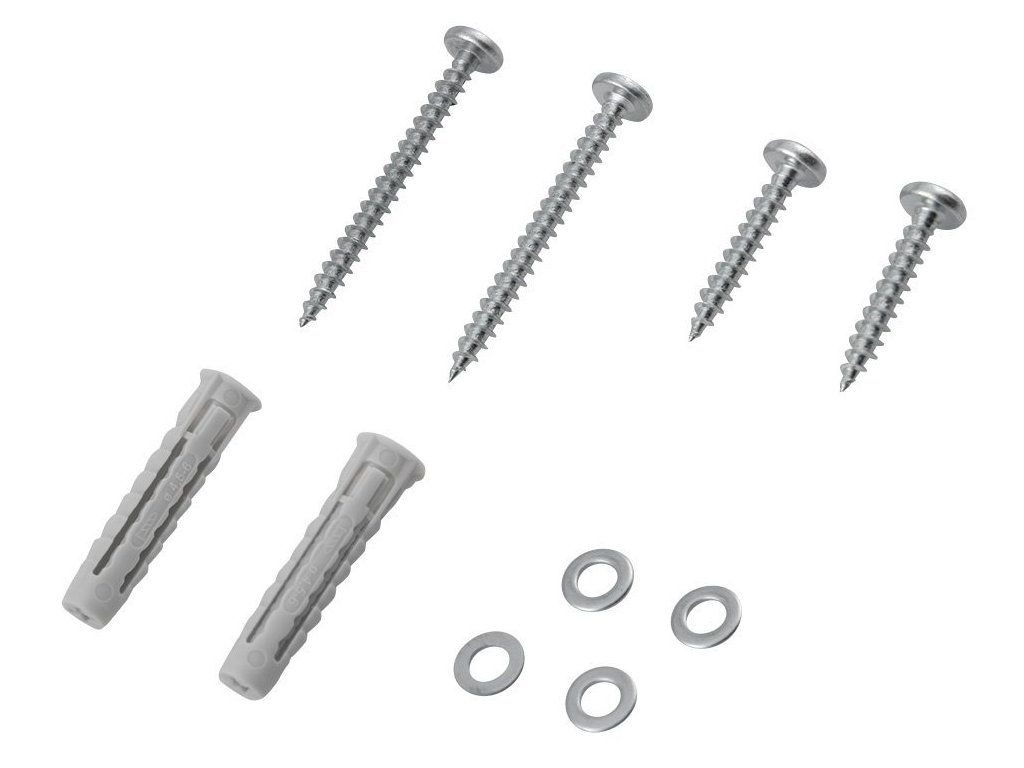 Sada obsahuje 2 hmoždinky, 2 vruty 5 × 50 mm s půlkulatou hlavou, 2 vruty 5 × 30 mm s půlkulatou hlavou a 4 podložky.